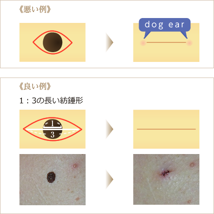 このdog earを少なくするために、両端に無理なく歪みが出ないように、ほくろの直径を1とすると約3倍の紡錐形の切除が必要となります。